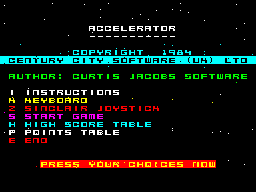 Developed by Curtis Jacobs Software Design Ltd., this game is a classic from the mid-1980s. It is a testament to the burgeoning creativity and technical experimentation of that time. The game captures the essence of racing competition while challenging players with its fast-paced mechanics and vibrant graphics.