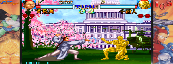 The visual style is distinct, with colorful and detailed sprites that bring each character to life. The backgrounds are richly designed, complementing the fast-paced action with dynamic environments. These visual elements create an immersive arcade experience indicative of its time.