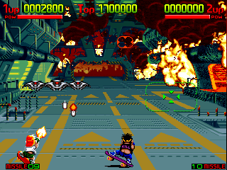In the game, players are tasked with saving the world from a nefarious alien invasion. The protagonist, a young hero equipped with a skateboard, maneuvers through a series of dynamic levels filled with hostile creatures and challenging obstacles. The gameplay is fast-paced, requiring quick reflexes and strategic shooting skills to succeed. Players must navigate both ground and aerial segments, battling a mix of alien soldiers and mecha-alligators.