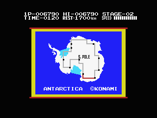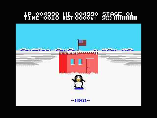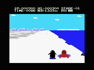 Players control a penguin as it races against time across scrolling maps. The objective is to reach the end of each stage before the timer runs out. Throughout the journey, players must avoid obstacles like ice crevices and aggressive sea life while picking up fish and other bonus items scattered along the way. These items contribute to the player’s score, adding a competitive edge to the challenge.