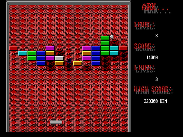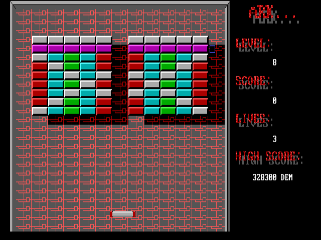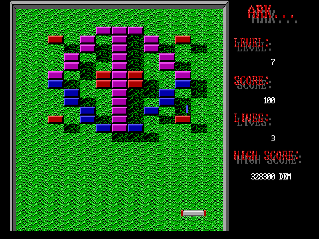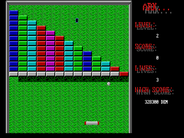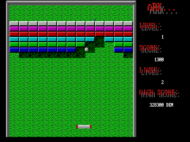 The game is a classic example of a 1980s arcade-style video game, where players navigate through various levels using a paddle to bounce a ball and break a series of bricks. This engaging and fast-paced gameplay captivated players, drawing them into a world of strategic ball control and brick-breaking action. The challenge lies in accurately aiming the ball to remove all bricks without losing the ball past the paddle.