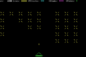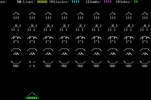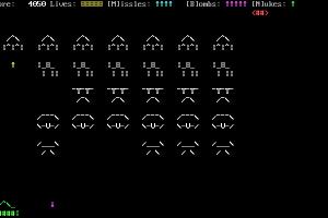 The gameplay mechanics are straightforward yet challenging. Players maneuver a spaceship represented by a simple character, often an arrow or a caret symbol. The objective is to shoot alien invaders descending from the top of the screen. Each invader, depicted using different ASCII characters, moves in a predictable pattern, challenging players to anticipate and react quickly.