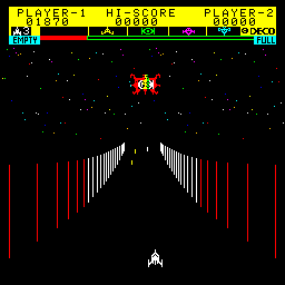 In this classic shooter, players take control of a spacecraft, navigating through deep space with the primary objective of fending off waves of enemy alien ships. The game is characterized by its fast-paced, action-packed sequences, requiring players to deftly maneuver their ship while simultaneously targeting and destroying adversaries.