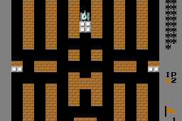The game features a top-down perspective where players control a tank. The primary objective is to destroy all enemy tanks on the map while protecting your own base, represented by an eagle emblem, from being captured or destroyed. The game includes a variety of challenging levels, each with different maze-like layouts formed by various obstacles such as bricks, bushes, and steel walls.