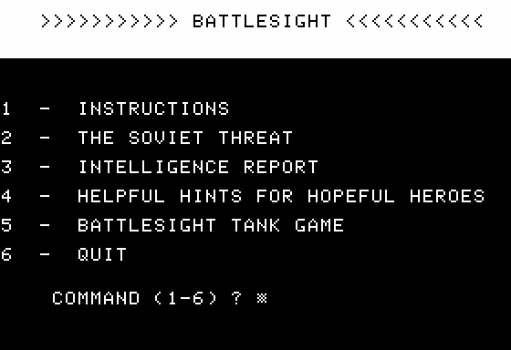 Battlesight is a vintage title from the early 1980s, immersing players in a captivating digital battlefield experience. Set against the backdrop of classic arcade-style gaming, this release takes players on a journey through strategic warfare, challenging them to outmaneuver opponents and dominate the virtual combat arena.