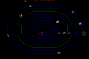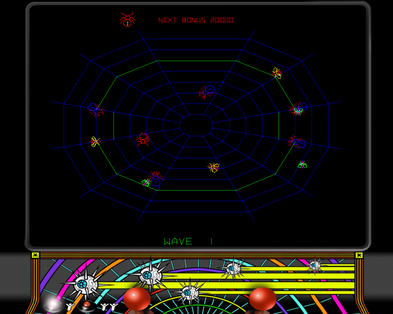 The game is a multidirectional shooter that leverages twin-joystick controls, one for movement and another for firing. As enemies appear in waves, players must strategically maneuver the spider across different paths of the web, avoiding contact while targeting threats. The unique movement pattern on the web adds a layer of complexity to how players must think and react during play.
