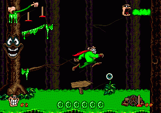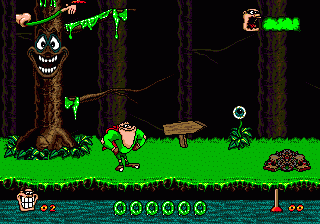 The game features side-scrolling action where players control the protagonist, who battles adversaries using projectiles such as mucus and flatulence. The objective is to progress through a series of levels set in grotesque and cartoonish worlds, each filled with unique obstacles and challenges. Players collect items and power-ups to enhance their abilities, adding a layer of strategy to the gameplay.