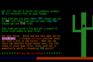 The game mechanics are simple yet engaging, inviting players to use quick reflexes and strategic planning. Players control a character that can move in four directions within a maze-like environment. The primary objective is to “feast” on bugs for points while dodging hazardous obstacles that appear increasingly as levels progress. Power-ups are frequently scattered throughout each level, providing temporary boosts such as increased speed or invincibility.