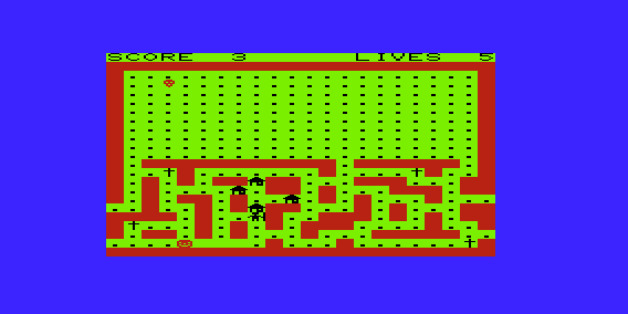 The game places the player in a maze-like environment where the main objective is to collect food items while avoiding obstacles. The enemies are programmed to follow specific patterns, which players must memorize to progress through levels. As the game advances, the difficulty escalates with faster enemies and more complex maze designs.