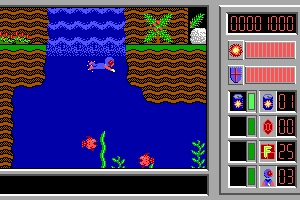 The core gameplay involves platforming action, where players guide the protagonist through diverse environments. Players must collect items, gain power-ups, and avoid or engage enemies. The game requires both strategic planning and quick reflexes to navigate its challenging levels successfully.