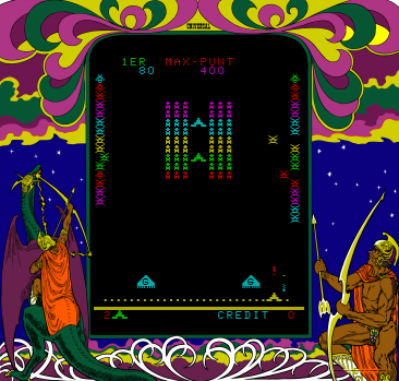 Released in 1979 by Universal Co., Ltd., this arcade game stands as a representation of early space-themed gaming. The gameplay involves defending your base against invading cosmic aliens that descend from the top of the screen. Players use a movable cannon to shoot the invaders before they reach the bottom and capture bases.