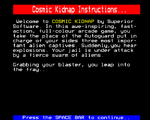 Released in 1984, this game is an engaging title for retro video game enthusiasts. Set in a cosmic backdrop, players are thrust into a world where they must navigate through challenging scenarios to rescue captives and restore peace to the universe.