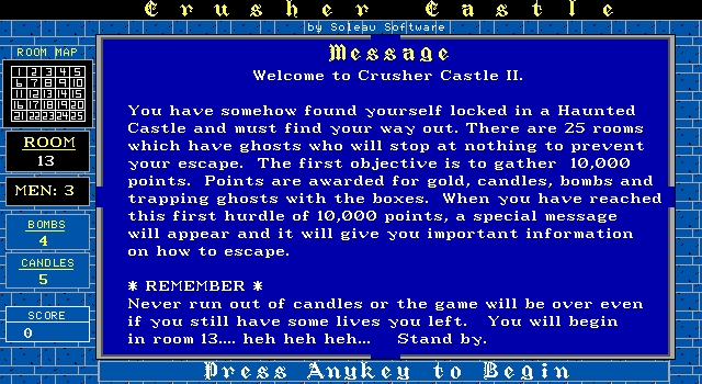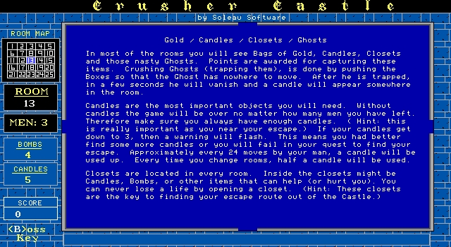 Crusher Castle II, developed by Soleau Software, Inc. and released in 1993, is a captivating puzzle game that challenges players to navigate through a mysterious castle filled with hidden traps and treasures.