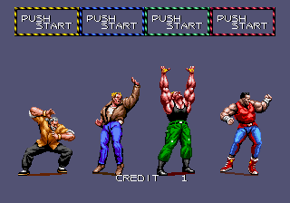 In this arcade classic, players can choose from a cast of four distinct characters, each with unique fighting skills and attributes. The game supports up to four players, making it a cooperative action experience. The main objective is to defeat enemies through hand-to-hand combat, employing a range of punches, kicks, and special moves. Players can also pick up objects in the environment to use as weapons, adding variety and strategy to their gameplay.