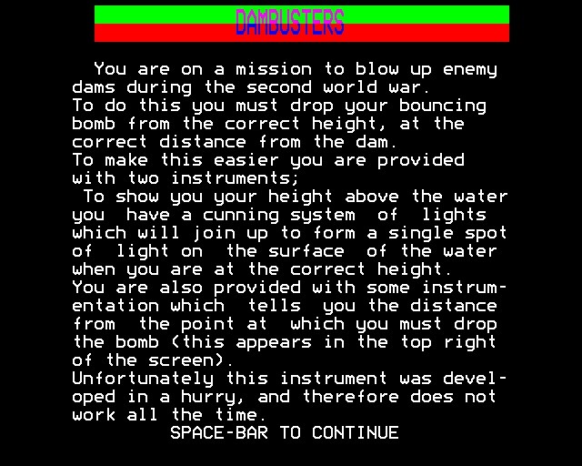 The game released in 1983 is a strategic flight simulation video game. In this game, players take on the role of the pilot of a Lancaster bomber, embarking on a daring mission that draws inspiration from the famous Operation Chastise conducted by the Royal Air Force during World War II.