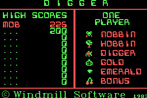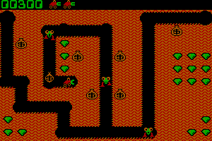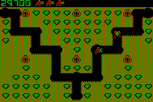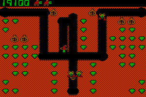 Players control a character in an overhead view, navigating through a maze-like environment filled with dirt, collecting valuable emeralds, and avoiding enemies. The objective is to dig through the levels to collect all gems while strategically avoiding or dealing with enemies that chase the player throughout the game. The player can also find and use items to aid in their quest.