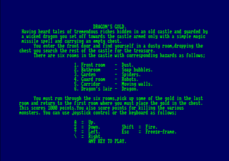 Released in 1984 by Romik Software Ltd, this game transports players to a fantasy realm filled with adventure and danger. Tasked with the mission to retrieve a legendary treasure from the clutches of a fearsome dragon, players must navigate through a series of perilous challenges.