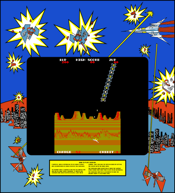 Released in 1983, this title was a significant entry in the shooter arcade game genre. Set in a vibrant, scrolling space environment, players are tasked with piloting a starfighter against waves of relentless alien forces. The game focuses on fast-paced action and requires dexterity and quick reflexes from players.