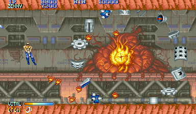 Released in 1991 by Capcom Co., Ltd., this game stands as a classic example of the side-scrolling shooter genre that captivated audiences in arcades and home consoles alike. Set in a dystopian future where players take on the roles of “Nameless” heroes equipped with powerful weaponry, the game is a thrilling fight against various alien enemies.