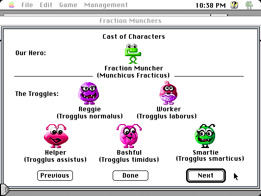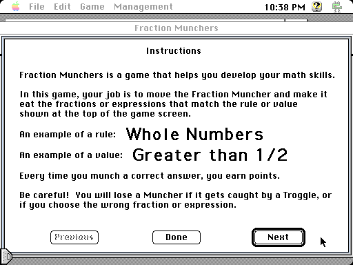 Launched in 1992 by the Minnesota Educational Computing Consortium (MECC), this educational video game was designed to make learning fractions engaging for children. Players navigate through various levels by solving fraction-based puzzles, targeting an educational experience that marries fun with learning.
