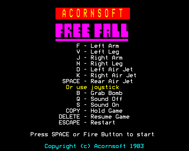 Released in 1983, Free Fall is a classic video game from the early era of digital gaming that captures the charm and simplicity characteristic of games from that time. Developed for platforms like the Atari 8-bit family, the game is a testament to the creative explorations of developers during the 1980s.