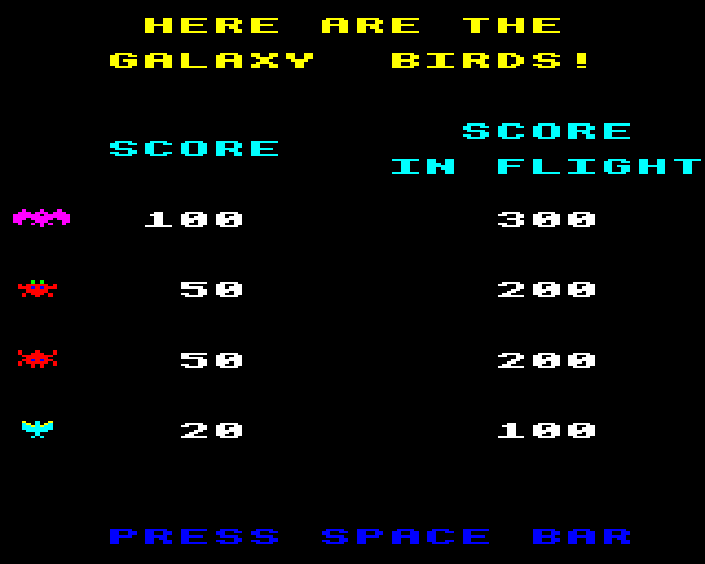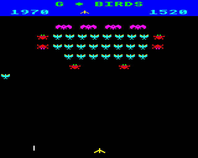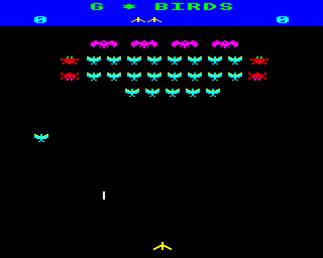 Players navigate through various galactic settings piloting a spacecraft, with the primary objective of shooting down waves of bird-like aliens. The gameplay is simple yet engaging, focusing on hand-eye coordination and quick reflexes. Points are awarded for each enemy defeated, and players can gain power-ups to enhance their spacecraft’s abilities.
