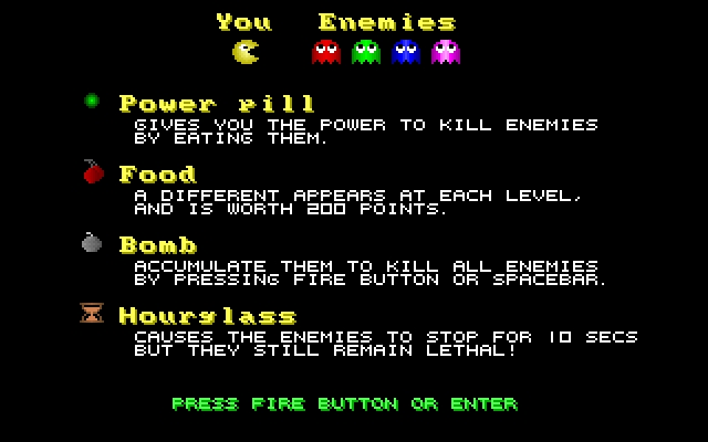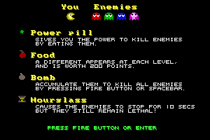 The core objective is to guide the character through each maze, collecting specific items while evading or confronting various obstacles and enemies. The game requires strategic movement and quick reflexes to successfully gather all items and progress to the subsequent levels.