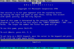 Gorillas is a classic video game developed by Microsoft Corporation and released in 1991. This game is a part of the MS-DOS 5.0 Operating System’s entertainment package, specifically designed to demonstrate the capabilities of the QBasic programming language.