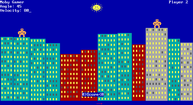 The gameplay is simple yet engaging, featuring two gorillas positioned on a cityscape filled with skyscrapers. The objective is for each gorilla to throw explosive bananas at the other, adjusting angle and velocity to account for city obstacles and factors like gravity and wind resistance. The player takes turns controlling these gorillas, with the goal of hitting the opponent gorilla in order to win the game.