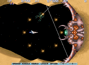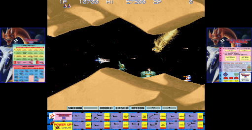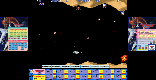 The primary objective of the game is to advance through various levels, each uniquely themed and challenging. Players collect power-ups to enhance their ship’s capabilities, including increased speed, missiles, lasers, and the shield-providing “Option” satellites. Timing and strategy play crucial roles, as players must choose when to deploy power-ups to maximize their effectiveness during intense battles.