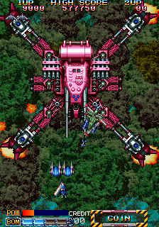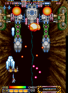 The game features classic shoot ’em up mechanics, where players navigate through vertically scrolling stages. The primary objective is to dodge enemy fire while strategically using an array of weapons to eliminate adversaries. Players can collect power-ups throughout the stages to enhance their aircraft’s offensive capabilities, improving both weapon strength and firing rate.