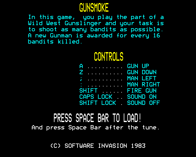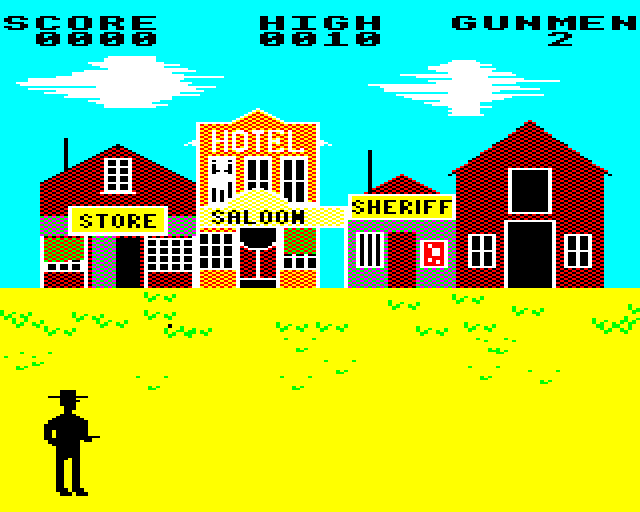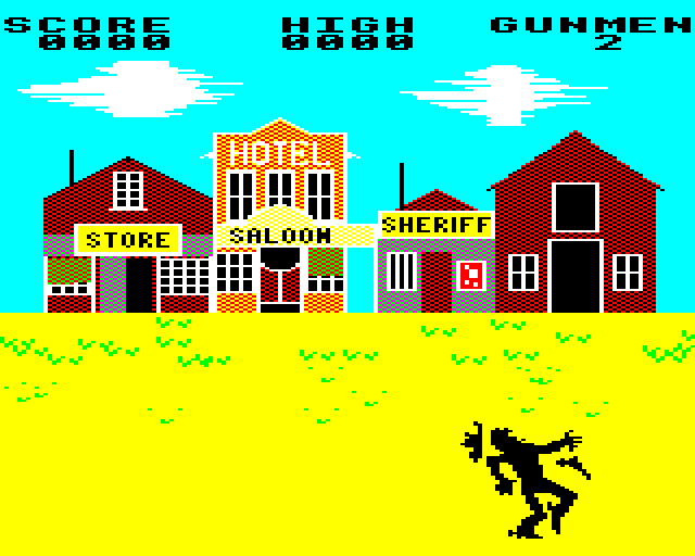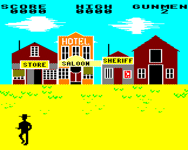 The game presents a vertically scrolling environment where players navigate through various levels filled with enemies. Armed with a revolver, players can walk in eight directions and shoot at bandits, dodge bullets, and collect power-ups to increase their firepower. Unique elements include horseback riding sequences, adding to the game’s dynamic experience.