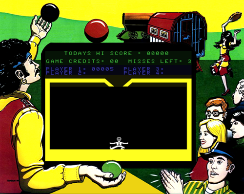 The gameplay involves skillful timing and precision, as players must manage a series of juggling acts presented on the screen. The objective is to keep the objects in the air, requiring quick reflexes and careful coordination, demonstrating the fundamental principles of early arcade gaming mechanics.