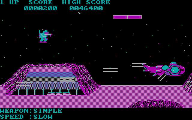 The game features horizontal scrolling and includes creative weapon upgrades and power-ups that players can acquire throughout the game. Players can switch between multiple weapons, each with unique abilities, which provides a strategic element to the fast-paced shooting action. A notable aspect is the ability to shoot in multiple directions, offering a dynamic gaming experience.
