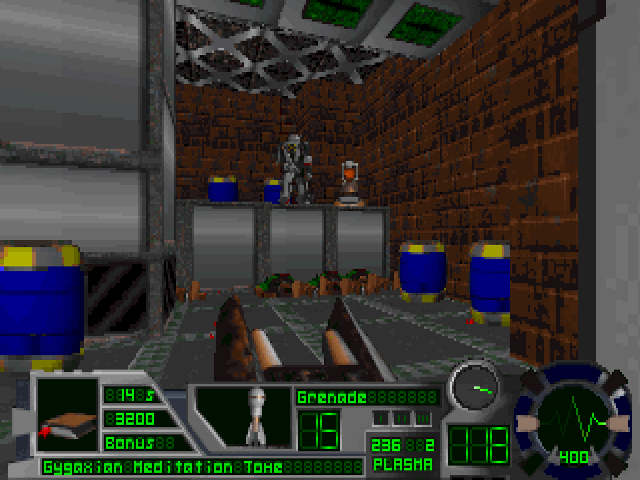 The game features a variety of weapons and enemies, offering players a classic first-person shooter experience. It includes multiple levels where players navigate through futuristic environments, aiming to collect items and eliminate foes.