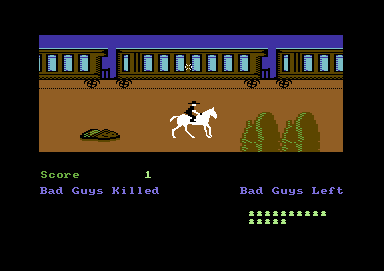 The game features colorful graphics typical of the late 1980s, with detailed environments that evoke the rugged landscapes and towns of the Wild West. The sound design includes chiptune music and effects that enhance the immersive experience, despite the technical limitations of the era.