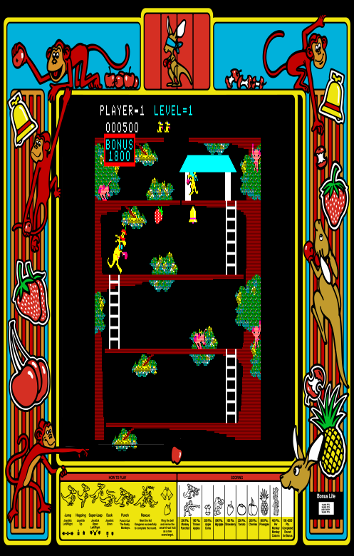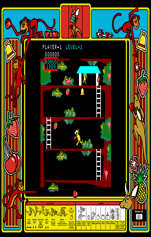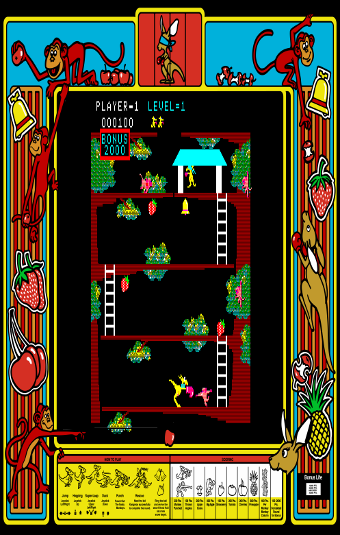 The aim is to safely guide the mother kangaroo to her baby, who is trapped at the top of each level. As players ascend through the vertical levels, they must eliminate or dodge the monkey foes and pick up fruit bonuses for extra points.