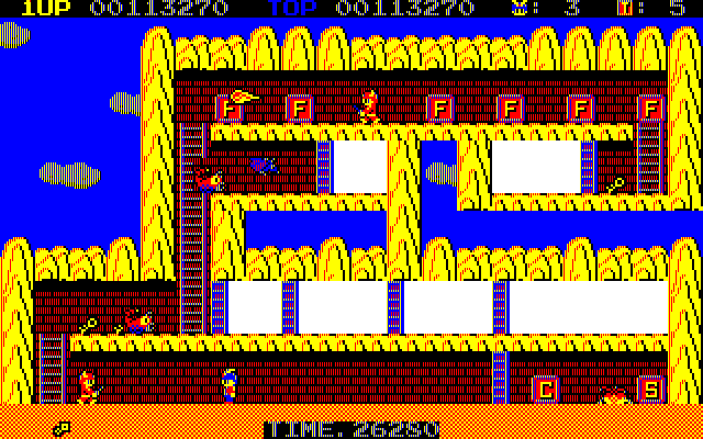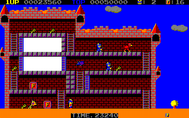 Typical of the late 1980s arcade style, the game features pixelated graphics that charm with their simplicity and nostalgic appeal. The sound design enhances the atmosphere, featuring chiptune melodies that complement the game’s intense pace and action-packed scenes.