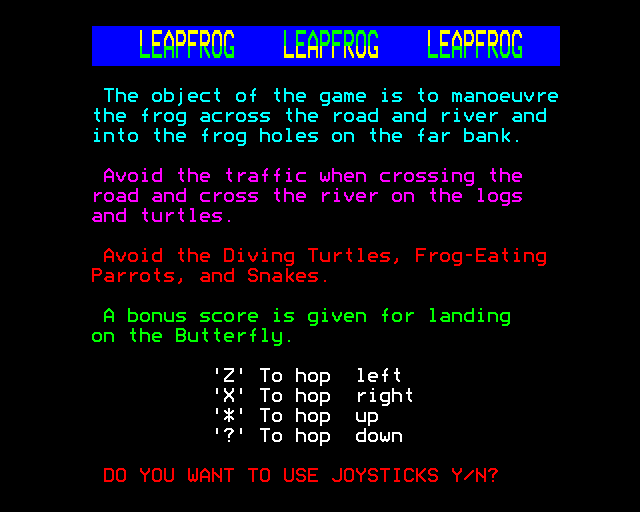 The player controls a frog whose aim is to leap across different platforms while avoiding obstacles and enemies. The game is divided into several levels, each increasing in difficulty. The player must time the frog’s jumps carefully to land safely on platforms, collect bonuses, and reach the end goal.