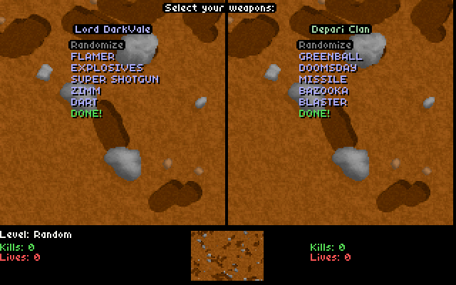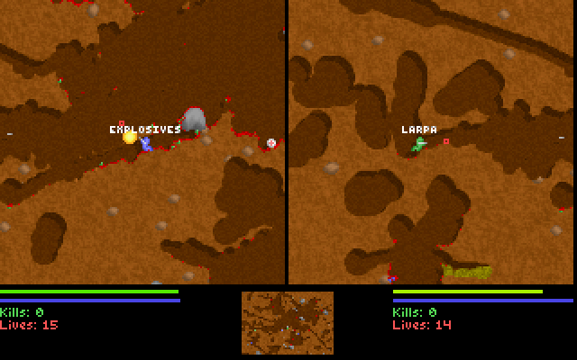 In Liero, two players face off in a side-scrolling battle arena. The objective is simple: eliminate the opponent while dodging their attacks. Players can choose from a wide range of weapons, including bazookas, grenades, and rifles, to name a few. The environment is completely destructible, allowing players to carve out their strategies and hideouts.