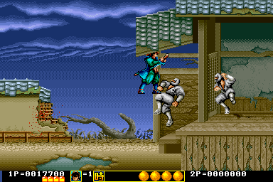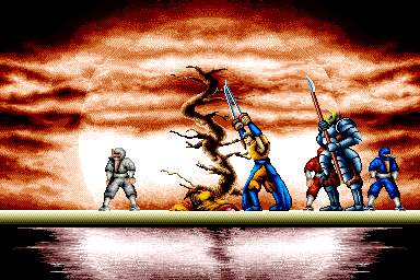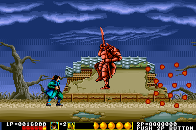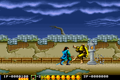 Players assume the role of a warrior armed with a mystical sword, battling through various levels filled with enemies and obstacles. The game is designed with vibrant pixel art graphics typical of its era, featuring a side-scrolling perspective that was popular in arcade games of the early ’90s.