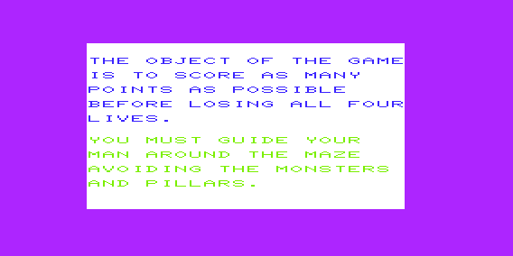 Utilizing a simple control scheme typical of early 80s video games, players maneuver through each maze using a joystick and a single button. The minimalist graphics and sound effects provide an immersive old-school arcade experience, appealing to both nostalgic players and newcomers interested in retro gaming.
