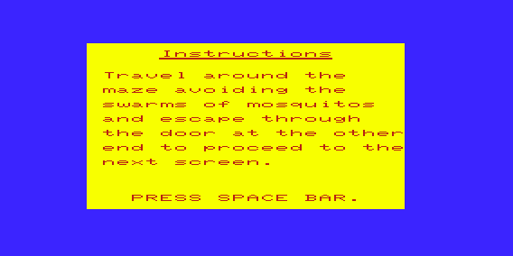 Released in 1984, this video game presents a unique arcade-style challenge centered around the task of guiding a mosquito. As a player, your primary objective is to navigate through various levels, avoiding obstacles and collecting points. The game’s simplistic graphics and interface reflect the technological limitations and style of its time, offering a nostalgic trip back to the early days of gaming.