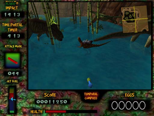 Released in 1998, Nanosaur is an action-adventure game developed by Pangea Software, Inc.. The game is set in a futuristic world where players take on the role of a time-traveling dinosaur, specifically a genetically enhanced raptor, tasked with retrieving dinosaur eggs from the past and returning them to the future. The primary objective is to ensure the continuation of the species while battling against other dinosaurs and environmental hazards.