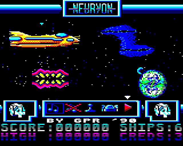 Given its release in 1990, the game features pixelated graphics typical of the era, offering a nostalgic reminder of early computing and gaming aesthetics. The soundtrack and sound effects complement the action, amplifying the intensity of space battles with synthesized music and explosive sound effects.