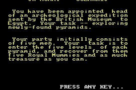Released in 1984 by Gem Software, this video game is an arcade-style maze game where players assume the role of an archaeologist exploring ancient Egyptian tombs. The objective is to uncover all treasures and face the mummy obstructions while navigating through the intricate maze.