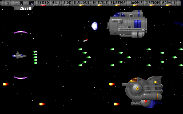 The game features a straightforward yet engaging gameplay style typical of arcade shooters. Players control a spaceship, navigating through waves of enemy ships, avoiding incoming fire, and collecting power-ups that provide temporary boosts and enhancements. Each level concludes with a challenging boss fight, testing players’ reflexes and strategic prowess.