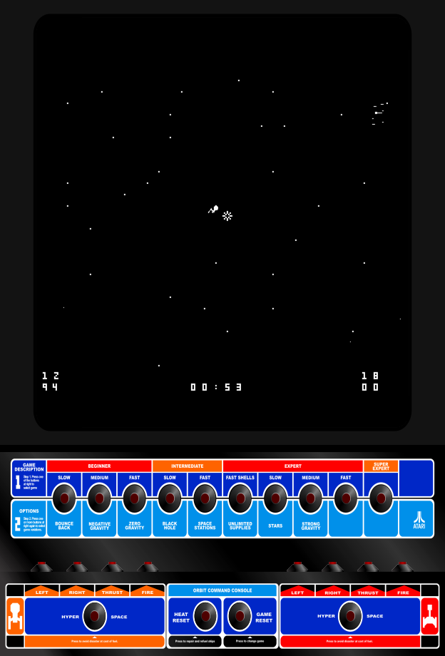 Released in 1978 by Atari, Inc., this game is a space combat arcade game blending strategy and action. Players control spacecrafts tasked with navigating space terrain and battling opponents by aiming and shooting. Predominantly designed for a competitive two-player experience, it emphasizes reflexes and strategic planning.