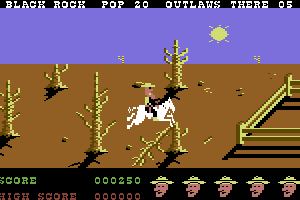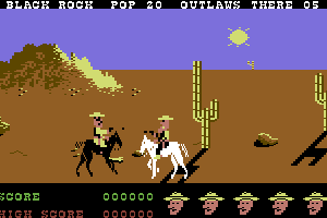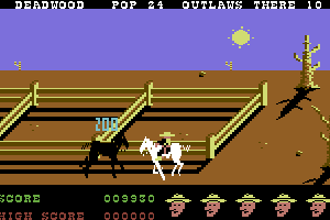 The game showcases the graphics typical of its era, offering a pixelated yet charming depiction of sandy deserts and rustic towns. The sound design complements the visuals with engaging audio effects that add to the immersion, recreating the atmosphere of a Western movie with each encounter.