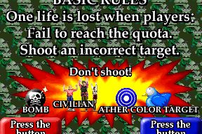 The core of the game consists of multiple stages, each with its own unique set of targets and objectives. Players must use light gun peripherals to shoot targets that appear on-screen, ranging from stationary objects to moving items and even bonus rounds. The accuracy and speed of the player’s shooting determine their score, encouraging replayability to achieve higher scores.